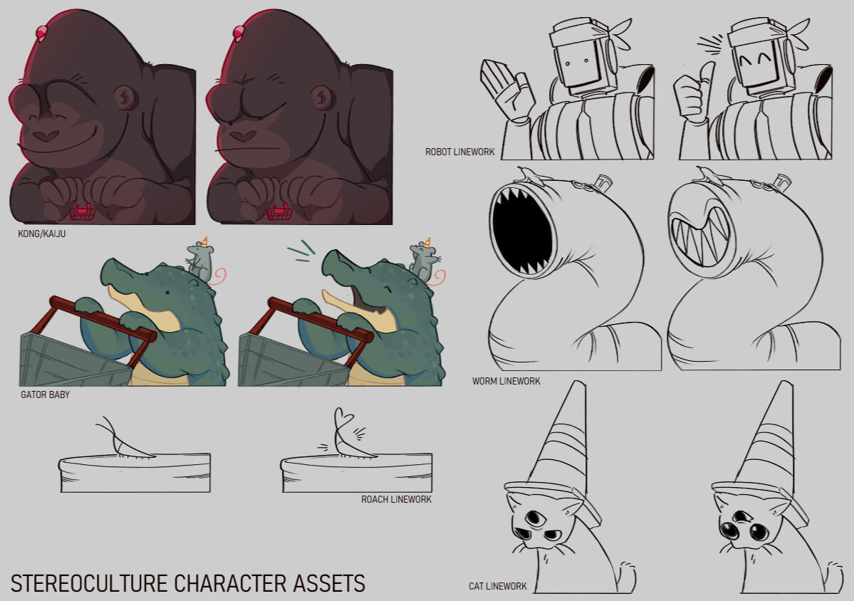 Background, UI and Character assets for Stereoculture, a musical garden management simulator for Game Maker's Toolkit Game Jam 2024.The game is a cutesy trashpunk/post apocalyptic farming sim about a giant alligator growing music out of planting junk and harvesting different sounds and tunes to compose music for various customers.The UI assets shown belong to an in-progress build for a visual rehaul with more time. The characters were drawn by me before being passed down to another artist in a pipeline.